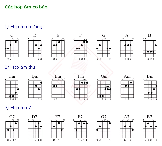 - Học từ sơ đồ hợp âm: Sử dụng bảng hợp âm guitar để tra cứu các thế bấm khác nhau. Hãy chú ý đến các ghi chú về phím đàn và dây cần bấm.